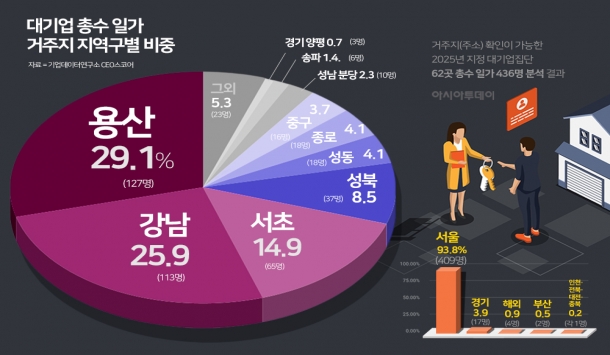 국내 대기업 총수 일가 10명 중 7명은 서울 용산·강남·서초구에 거주하고 있는 것으로 나타났다. 특히 용산구 이태원·한남동 일대에 거주하는 비중이 20%를 넘는 재벌 밀집 지역으로 조사됐다. 17일 기업데이터연구소 CEO스코어가 거주지(주소) 확인이 가능한 2025년 지정 대기업집단 62곳의 총수 일가 436명을 분석한 결과, 전체의 93.8%에 해당하는 409명이 서울에 주소를 두고 있었다. 서울 외 지역 거주자는 경기도 17명(3.9%), 해외 4명(0.9%), 부산 2명(0.5%), 인천·전북·대전·충북 각 1명(0.2%) 순으로 집계됐다. 서울 내에서는 용산·강남·서초 3개 구에 거주하는 총수 일가가 전체의 69.9%인 305명에 달했다. 구별로는 용산구가 127명(29.1%)으로 가장 많았고, 강남구 113명(25.9%), 서초구 65명(14.9%)이 뒤를 이었다. 해당 자치구들은 전국에서 집값이 비싼 곳으로 유명하다. 동(洞) 단위로 보면 용산구 이태원·한남동에..