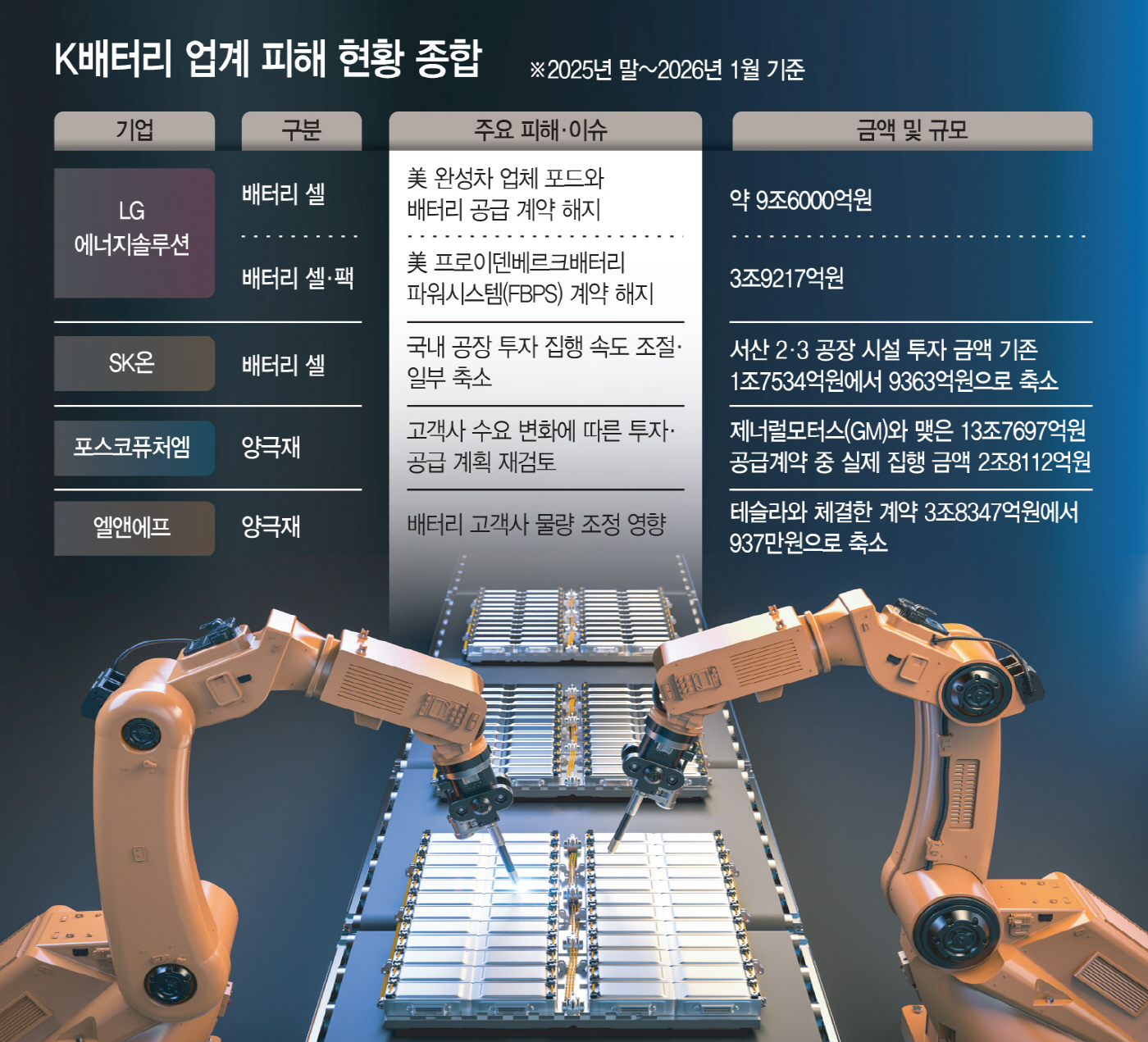 국내 배터리 업계의 2026년 출발선은 밝지 않다. 지난해 4분기부터 잇달아 쏟아진 계약 해지와 투자 축소 공시가 이어지고 있기 때문이다. 'K배터리 성장 스토리'에 제동이 걸렸다는 평가가 나온다. 미국과 유럽의 전기차(EV) 정책 기조 변화 속에 글로벌 완성차 업계가 전동화 전략을 수정하면서, 배터리 셀·소재 기업이 직접적인 영향을 받고 있다. 4일 업계에 따르면, 지난해 말부터 국내 주요 배터리 기업들은 계약 취소와 투자 조정 등 악재성 공시를 연이어 내놓았다. 전기차 시장 성장 둔화가 장기화되는 가운데, 미국과 유럽을 중심으로..