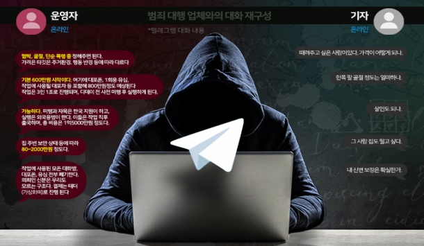 "돈만 주면 뭐든지 합니다. 사람도 죽여 드립니다." 텔레그램에서 '범죄 대행' 채널에 접속해 말을 건 지 몇 초도 채 지나지 않아 답장이 왔다. 인터넷 검색만으로도 이들의 채널 주소를 쉽게 찾을 수 있었다. 이곳은 마치 캄보디아 범죄 단지 '시아누크빌'을 사이버 세상으로 옮겨 논 듯했다. 이들에겐 무엇을 할지가 아니라, 얼마인지가 중요했다. 돈만 주면 못할 짓이 없기 때문이다. 채널에는 살인·폭행·해킹·위조 등 의뢰 목록이 있었다. 식당 메뉴 고르듯 하나를 선택하면 견적을 내어준다. 폭행·절도의 경우 폐쇄회로(CC)TV 수 등 거주지 보안 상태, 증거인멸을 위한 관제서버 해킹 여부에 따라 80만원에서 수천만원까지 천차만별이었다. 기자는 신분을 밝히지 않고 "한 남성의 팔 하나를 부러트려 달라"고 주문했다. 해당 범행의 단가는 600만원부터 시작이었다. 운영자는 "집 주변 잠복하고 타깃의 동선까지 다 본다"며 최소 2~3일간 미행 등을 진행한 뒤 실행에 들어간다고 말했다. 사..