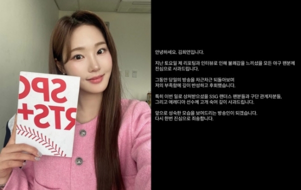 MBC스포츠플러스(엠스플) 중계 과정에서 불거진 인종차별 논란의 장본인인 김희연 아나운서가 공식 사과문을 올렸다. 김 아나운서는 지난 9일 자신의 인스타그램을 통해 "지난 토요일 제 리포팅과 인터뷰로 인해 불쾌감을 느끼셨을 모든 야구 팬분께 진심으로 사과드린다"며 "방송을 되돌아보며 부족함을 깊이 반성했다"고 밝혔다. 이어 SSG 랜더스 팬들, 구단 관계자, 외국인 선수 기예르모 에레디아를 직접 언급하며 고개를 숙였다. 그는 "앞으로 성숙한 모습을 보여드리는 방송인이 되겠다. 다시 한번 진심으로 죄송하다"고 끝을 맺었다. 논란..