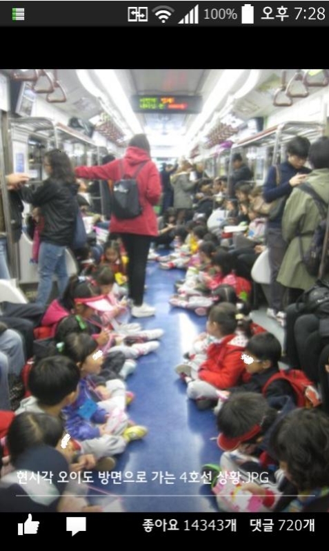 공개된 사진에는 지하철 4호선 열차 안, 의자에 앉아있거나 서 있는 승객들 사이로, 열차 안 복도에 일렬로 앉은 아이들이 눈에 띈다.