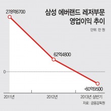 레저 부문의 영업이익은 최근 급격한 감소 추세를 보이고 있다. 지난해 영업이익은 62억4800만원으로 2011년(278억6700만원)보다 5분의 1수준으로 급감했다. 2009년(148억원), 2010년(140억원)과 비교해도 절반 이하로 감소했다.