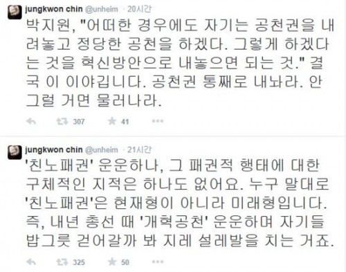 진중권 교수는 16일 자신의 트위터에 "'친노패권' 운운하나, 그 패권적 행태에 대한 구체적인 지적은 하나도 없다. 누구 말대로 '친노패권'은 현재형이 아니라 미래형이다"라고 글을 게재했다. 이어 "내년 총선 때 '개혁공천' 운운하며 자기들 밥그릇 걷어갈까 봐 지레 설레발을 치는 거다"고 운을 띄었다.