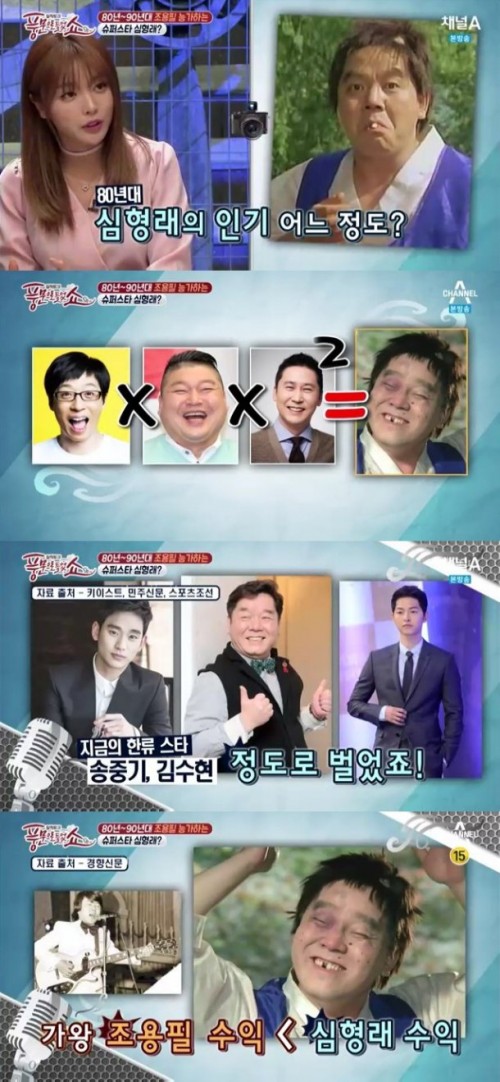또 다른 출연자는 "지금의 김수현과 송중기만큼 번 것이다. 당시 안성기 출연료가 1500만 원이었고 심형래 출연료가 2억 원이었다"고 설명했다.