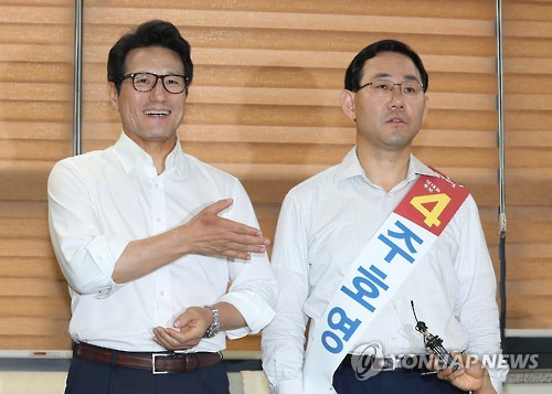 | 새누리당 비박(비박근혜)계인 주호영 후보가 8·9 전당대회 당 대표 후보 단일화 여론조사에서 승리했다. 5일 오후 충남 천안시 유관순체육관에서 열린 새누리당 대표·최고위원 선출 충청권 합동연설회를 마치고 정병국 후보가 주호영 후보로 단일화하겠다는 여론 조사 결과를 발표하고 있다. |