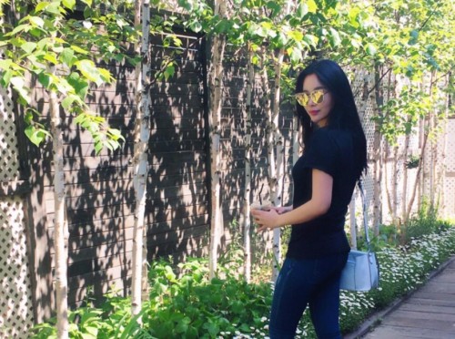 사진 속 조정민은 몸에 붙는 검정색 티셔츠와 청바지 차림으로 옆으로 살짝 돌아 포즈를 취하고 있다.