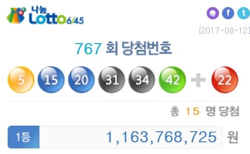 나눔로또 1등 당첨번호는 ‘5, 15, 20, 31, 34, 42’로 보너스번호는 ‘22’이다. 이번 회차의 1등 당첨자는 총 15명, 각자 11억6377만원씩 상금을 받는다.