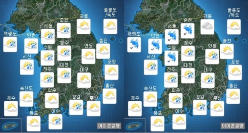 22일 기상청에 따르면 내일 중부지방은 대체로 흐리고 아침부터 비가 오는 곳이 있겠다. 남부지방은 구름이 많고 대기불안정으로 낮부터 밤 사이에 제주도는 새벽에 소나기가 오는 곳이 있겠다.