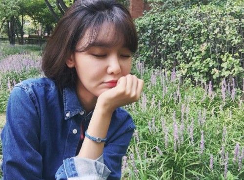 사진 속에서 그는 단발 헤어스타일로 캐주얼한 차림을 하고서 꽃밭에 앉아 생각에 잠긴 듯한 표정을 짓고있다.