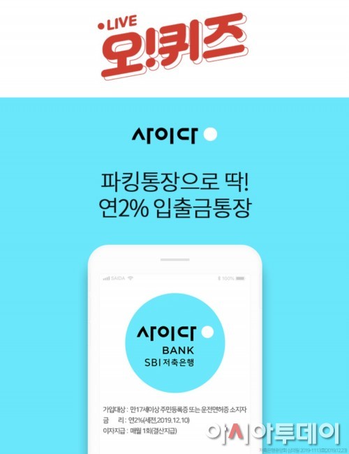 24일 OK캐쉬백은 이날 오전 9시 오퀴즈 천만원 이벤트를 통해 "OOOOOO이라면 주목해야 할 파킹통장! 하루만 맡겨도 연 2.0% 이자 주는 사이다뱅크 입출금통장"이라는 문제를 출제했다.