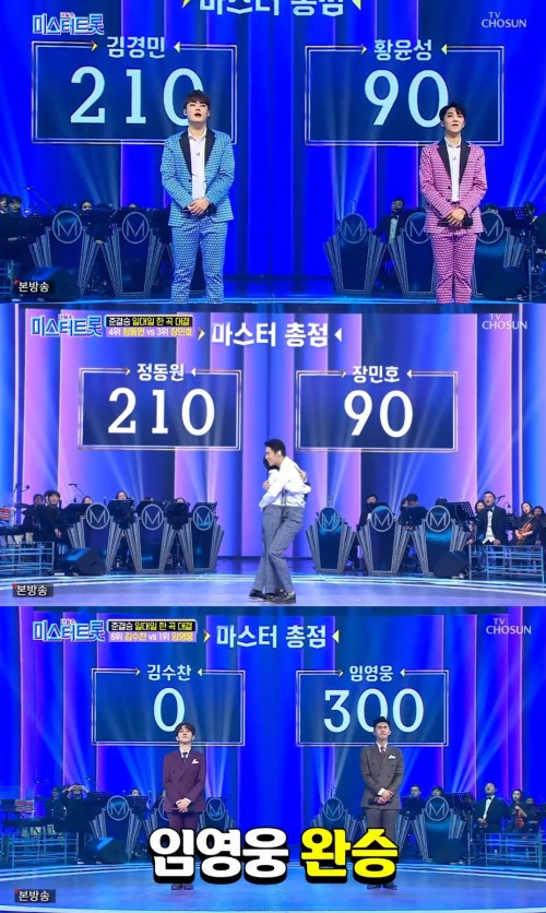 마스터 점수 결과 300대 0으로 이찬원이 몰표를 받았다.
