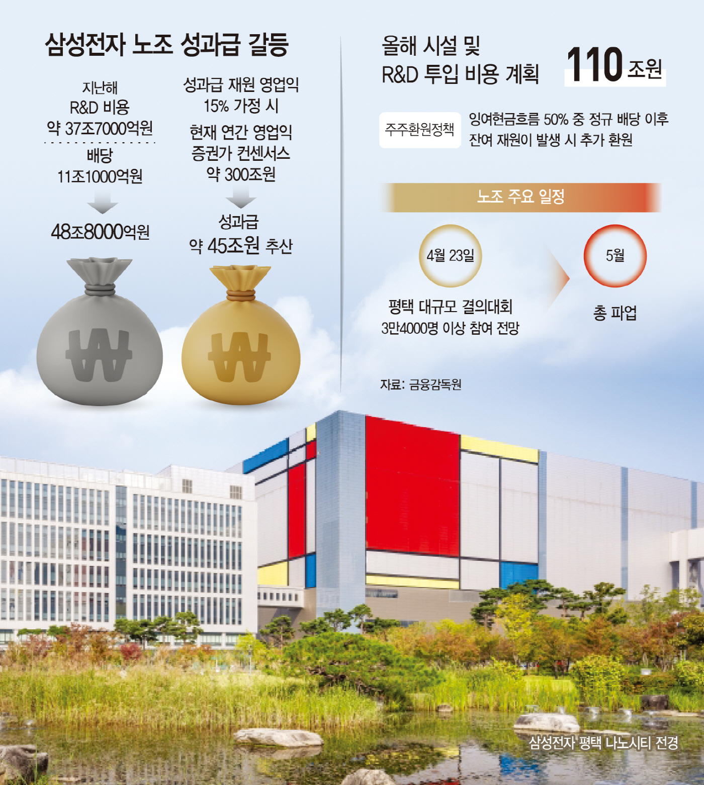 삼성전자 노동조합의 평택 대규모 결의대회가 열흘 앞으로 다가온 가운데 노조가 최근 1분기 실적 발표 이후 성과급을 영업이익의 약 15%로 요구한 것으로 나타났다. 증권가에서 추정하는 연간 예상 영업이익은 200조원 후반대에서 300조원 이상을 보는 곳도 등장했다. 연간 영업이익을 300조원으로 가정했을 때 성과급 재원은 45조원이다. 삼성전자는 역대급 연구개발(R&D) 및 시설 투자 재원과 함께 배당 재원을 마련해야 하는 상황으로, 이는 주주들과도 갈등을 빚을 수 있는 지점이라는 시각이 나온다. 문제는 현재 중동 전쟁 등 외부 리스..
