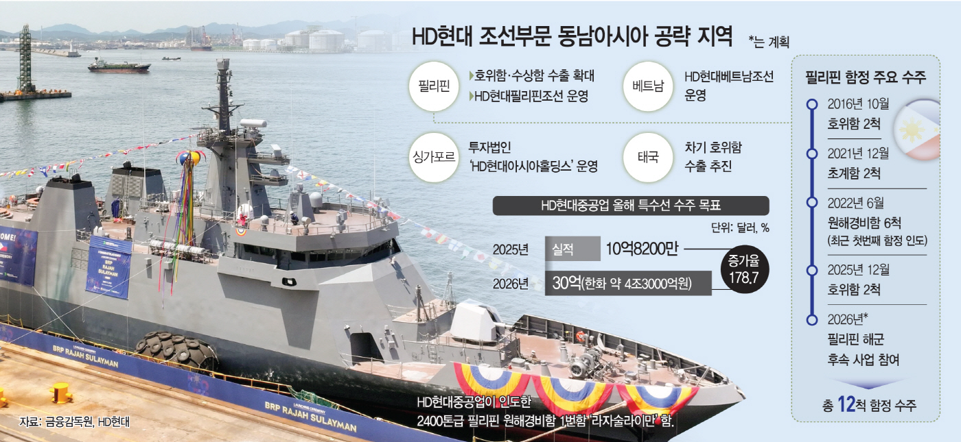 HD현대가 동남아시아 방산 시장에서의 존재감을 키우고 있다. 필리핀으로부터 수주한 함정을 조기에 인도하면서다. 필리핀, 태국 등 동남아 시장은 선박 건조를 시작으로 기술 지원과 유지·보수·정비(MRO)까지 사업 영역을 확장할 수 있는 '알짜' 지역이다. 국내 조선업계가 북미 진출을 병행하는 상황에서, 실제 건조와 인도가 진행되고 있는 동남아 지역은 당장의 실적을 가늠할 무대로도 평가된다. 23일 조선업계에 따르면 HD현대중공업은 현재까지 필리핀에 총 12척의 함정을 수주하며 핵심 파트너로 자리매김했다. 2016년 필리핀 국방부로부터..