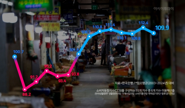 소비자심리지수가 한 달 만에 다시 나빠졌다. 환율이 가파르게 오르면서 물가 전반이 상승하자 소비자들이 느끼는 체감 경기도 악화된 탓이다. 집값 상승 기대는 연이은 정부 대책에도 다시 반등했다. 한국은행이 24일 발표한 12월 소비자동향조사에 따르면 이달 소비자심리지수(CCSI)는 109.9로 지난달(112.4)보다 2.5포인트 하락했다. 지난해 12월 이후 1년 만에 최대 하락폭이다. 앞서 소비자심리지수는 관세 협상 타결과 시장 전망치를 상회한 3분기 GDP 성장률 등의 영향으로 지난달 2.6포인트 상승했지만, 한 달 만에 다시 떨어졌다. 소비자심리지수는 현재생활형편·생활형편전망·가계수입전망·소비지출전망·현재경기판단·향후경기전망 등 6개 지수를 이용해 산출한 지표다. 100보다 클 경우 경제상황에 대한 소비자의 주관적인 기대심리가 낙관적임을, 작을 경우에는 비관적임을 뜻한다. 6개 지수 가운데 현재경기판단(89)이 전월 대비 7포인트 하락하면서 하락폭이 가장 컸다. 같은 기간 향..