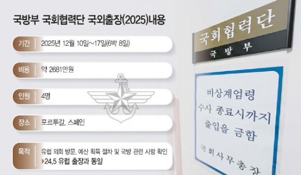 12·3 비상계엄 당시 계엄군의 국회 진입을 도와 '길잡이' 역할을 했다는 의혹을 받는 국방부 국회협력단이 수사가 한창인 지난해 말 유럽 출장을 다녀온 사실이 드러났다. 쇄신이나 징계가 아닌 '외유성 출장'이 주어진 것이다. 5·16 쿠데타 직후 창설된 국회협력단은 명확한 법적 근거 없이 '국방부와 국회의 소통'이라는 명목 아래 운영되고 있는 조직이다. ◇'계엄 길잡이' 의혹 속에도…'세금 2700만원' 들여 떠난 유럽 출장 18일 아시아투데이가 국방부로부터 단독으로 입수한 자료에 따르면, 국회협력단 소속 협력관 4명은 지난해 12월 10일 '공무국외출장'을 이유로 포르투갈로 출국했다. 포르투갈을 거쳐 스페인으로 이어진 일정은 같은 달 17일까지 6박 8일간 진행됐다. 우원식 국회의장은 계엄 수사 결과가 나올 때까지 국회협력단 폐쇄 명령을 내린 바 있다. 즉 국회협력단은 사실상 '운영 정지' 상태였지만, 해외 출장만은 강행한 것이다. 협력관 4명이 떠난 연수에는 국민의 혈세 26..