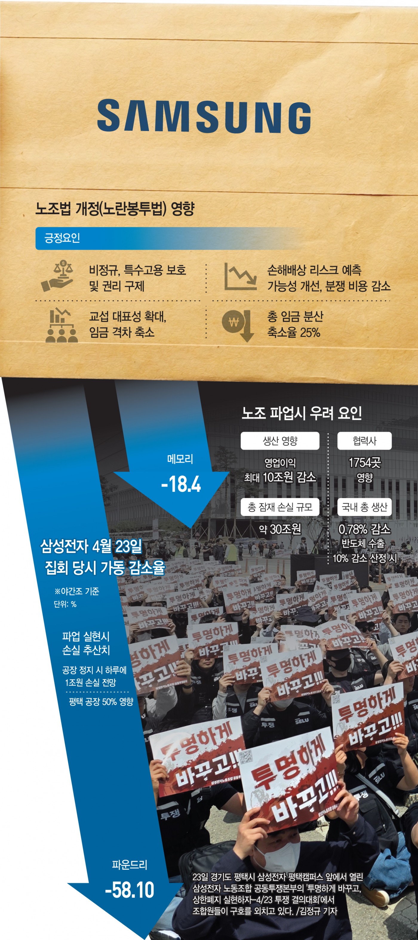 성과급 산정 기준 등을 둘러싼 삼성전자 노사 갈등이 결국 반도체 생산차질로 번졌다. 전날 노조의 대규모 집회 여파에 메모리 반도체와 비메모리 반도체 생산라인 가동률이 일제히 하락한 것으로 나타났다. 이 가운데 노조는 다음달 21일 총파업 당일, 이재용 삼성전자 회장 자택 앞에서 대규모 집회를 예고하는 등 사측을 향한 압박 수위를 높이고 있다. 24일 삼성전자 노조에 따르면 전날 오후 10시부터 이날 오전 6시까지 메모리 생산실적이 18.4% 감소했다. 노조는 전날 경기 평택캠퍼스에서 투쟁 결의대회를 열고, 성과급 상한선 폐지를 비..