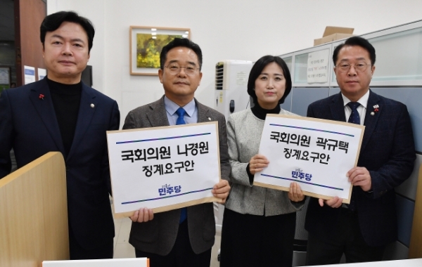 더불어민주당이 국민의힘 나경원·곽규택 의원에 대한 징계를 요구했다. 지난 9일 무제한 토론(필리버스터) 과정에서 국회법을 위반했다는 것이 이유다. 민주당 민병덕 의원, 김현정·문금주·백승아 대변인은 11일 국회 의안과를 찾아 두 의원에 대한 징게요구안을 제출했다. 민 의원은 "나 의원은 필리버스터를 하면서 '가맹사업법 개정안을 찬성하지만 8대 입법을 반대하기 위해 한다'고 했다. 의제와 다른 내용으로 필리버스터를 하겠다고 이야기한 것"이라며 "국회의장의 수차례 경고에도 의제로 돌아오지 않았다. 국회법을 위반해 의사일정을 방해했을..