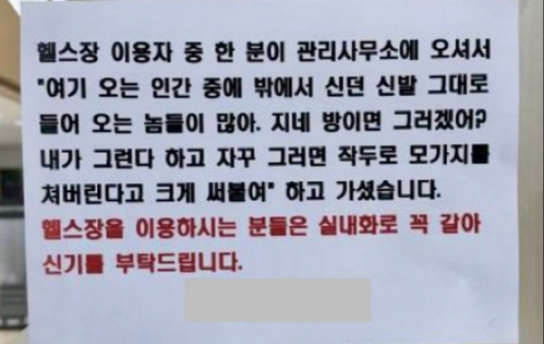 아파트 헬스장에 부착된 한 공지문이 온라인 커뮤니티에서 뜨거운 논쟁을 불러일으키고 있다. 최근 쓰레드에는 한 아파트 헬스장에 붙은 안내문 사진이 공유됐다. 해당 공지에는 "헬스장 이용자 중 한 분이 관리사무소에 찾아와 실외에서 신던 신발을 그대로 신고 들어오는 이용자들이 많다며 강한 불만을 제기했다"는 내용과 함께, 거친 표현이 그대로 담겨 있었다. 이후 관리사무소는 "헬스장을 이용하는 분들은 실내화로 꼭 갈아 신어달라"고 당부했다. 사진을 게시한 작성자는 "실외화를 신고 헬스장을 이용하는 행동이 잘못된 것은 맞지만, 관리소가..