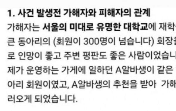 13세 여아를 성추행한 20대 남성 과외 교사의 신상정보가 온라인상에서 확산되며 논란이 일고 있다. 최근 인터넷 커뮤니티와 SNS에는 해당 남성으로 추정되는 인물이 재학 중인 학교 유튜브 채널 영상 캡처와 함께 이름 등 신상 정보가 공유되고 있다. 앞서 피해 아동의 어머니라고 밝힌 한 학부모는 자신의 딸을 상대로 성추행 혐의로 기소된 과외 교사가 집행유예를 선고받았다며 억울함을 호소했다. 최근 한 온라인 커뮤니티에는 해당 학부모가 사건 경위를 설명하는 장문의 글이 게시됐다. 글에 따르면 가해자로 지목된 남성은 서울 소재 한 대학에..