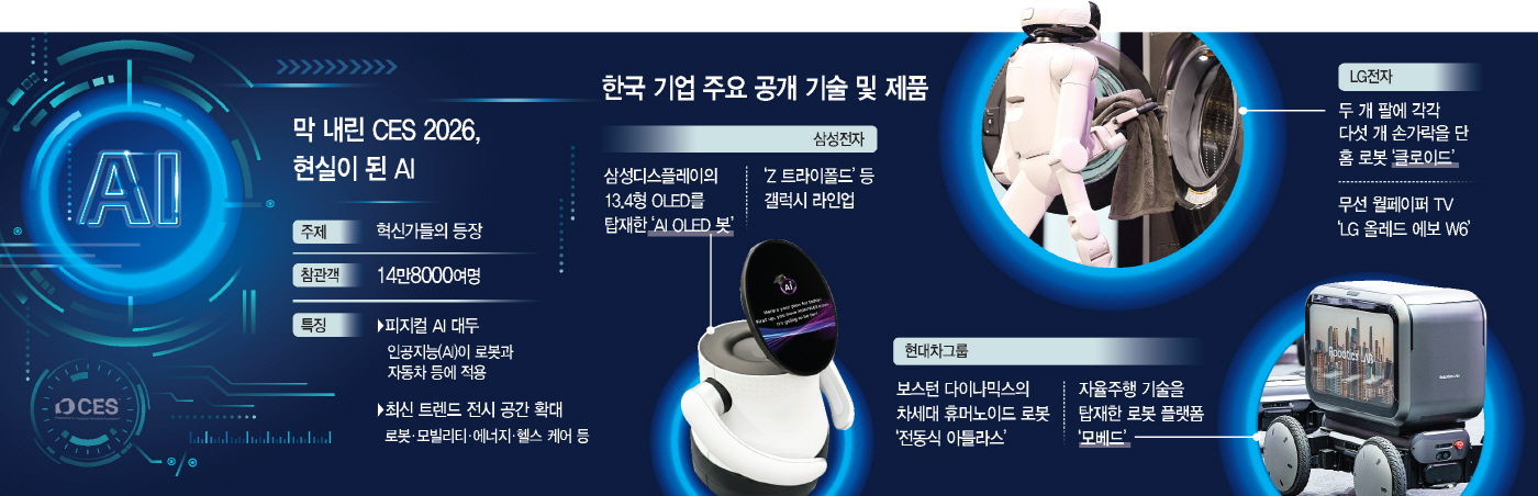 세계 최대 가전·IT 전시회 'CES 2026'이 성황리에 막을 내렸다. 올해 CES를 관통한 트렌드는 '피지컬 AI'다. 인공지능(AI)이 단순한 소프트웨어를 넘어 실물 시스템과 결합해 산업 현장에서 어떻게 작동하고 사업으로 이어질 수 있는지 보여주는 무대로 재편됐다. 특히 한국 기업들은 기술 콘셉트에 그치지 않고 실제 활용 장면을 전시하며 주목을 받았다. 11일 CES 주관사인 미국소비자기술협회(CTA)에 따르면 지난 9일(현지시간)까지 미국 라스베이거스에서 나흘간 열린 CES 2026에는 전 세계 158개국에서 참가해 총 46..
