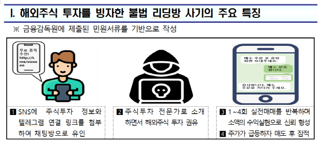 해외주식 투자 열기를 노린 불법 리딩방(투자유도방) 사기가 급증하고 있다. 금융감독원은 29일 SNS를 통해 투자자들을 텔레그램 등 비공개 채팅방으로 유인해 해외주식 투자를 권유하는 사례가 잇따르자, 금융소비자경보 '주의' 단계를 발령했다. 금감원에 따르면 불법업자들은 스레드(Threads)와 인스타그램 등에 '고수익 미국주식 투자전략' 등의 홍보글과 동영상을 게시해 투자자를 끌어들인 뒤, 비공개 채팅방에서 특정 종목의 매수 시점과 가격을 지시하는 방식으로 투자를 유도하는 것으로 나타났다. 초반 1~4회의 실전매매를 통해 소액 수...