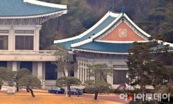 대통령실 청와대 복귀를 하루 앞둔 28일 청와대 모습이 비교적 한가로운 모습을 보이는 가운데 태극기 펄럭이고 있다. 봉황기는 29일 0시에 게양될 예정이다.사진은 28일 서울 종로구 정부서울청사에서 바라본 청와대 모습.
