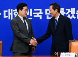 김병기 더불어민주당 원내대표와 송언석 국민의힘 원내대표가 9일 국회에서 우원식 국회의장 주재 여야 원내대표 회동을 마친 뒤 악수하고 있다.