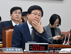 최교진 교육부 장관이 9일 국회에서 열린 교육위원회 전체회의에서 자리하고 있다.