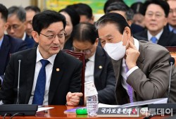 윤창렬 국무조정실장과 권오을 국가보훈부 장관이 28일 국회에서 열린 정무위원회의 국가보훈부, 국무조정실 등에 대한 종합감사에서 대화를 나누고 있다.
