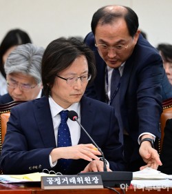 주병기 공정거래위원장이 28일 국회에서 열린 정무위원회의 국가보훈부, 국무조정실 등에 대한 종합감사에서 관계자로부터 자료를 건네받고 있다.