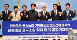 정인섭 한화오션 사장과 김형수 금속노조 거제통영고성조선지회장이 28일 국회 소통관에서 열린 한화오션 470억 원 손해배상청구소송을 취하 합의 원하청 노사 공동 기자회견에서 손을 맞잡고 있다. 왼쪽부터 김주영 더불어민주당 의원, 전현희 노동존중실천단장,강인석 부지회장, 김 지회장, 정 사장, 이용우 의원, 이동용 한화오션 사내협력사협의회 회장.