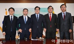 우원식 국회의장이 30일 국회에서 열린 의장 주재 여야 원내대표 회동에서 기념촬영을 하고 있다. 왼쪽부터 천준호 더불어민주당 원내운영수석부대표, 한병도 원내대표, 우원식 의장, 송언석 국민의힘 원내대표, 유상범 원내운영수석부대표.