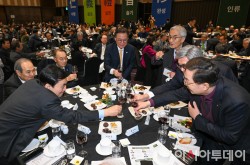 15일 오후 서울 광진구 워커힐호텔 워커홀에서 열린 성균관대학교 총동창회 2026년 신년인사회에서 주요 내빈들이 건배를 하고 있다. (사진 오른쪽부터 시계방향) 우종순 아시아투데이 회장, 안규백 국방부장관, 김성집 성균관대 총동창회장, 박재완 성균관대 이사장, 유지범 성균관대 총장, 김준영 성균관대 19대 총장·이사장, 류덕희 경동제약 회장. /정재훈 기자