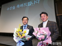 15일 오후 서울 광진구 워커힐호텔 워커홀에서 열린 '2026년 성균관대학교 총동창회 신년인사회'에서 자랑스러운 성균인상을 수상한 안규백 국방부장관(왼쪽)과 감사패를 수상한 고기봉 성균관대 총동창회 명예사무총장이 기념촬영을 하고 있다. /정재훈 기자