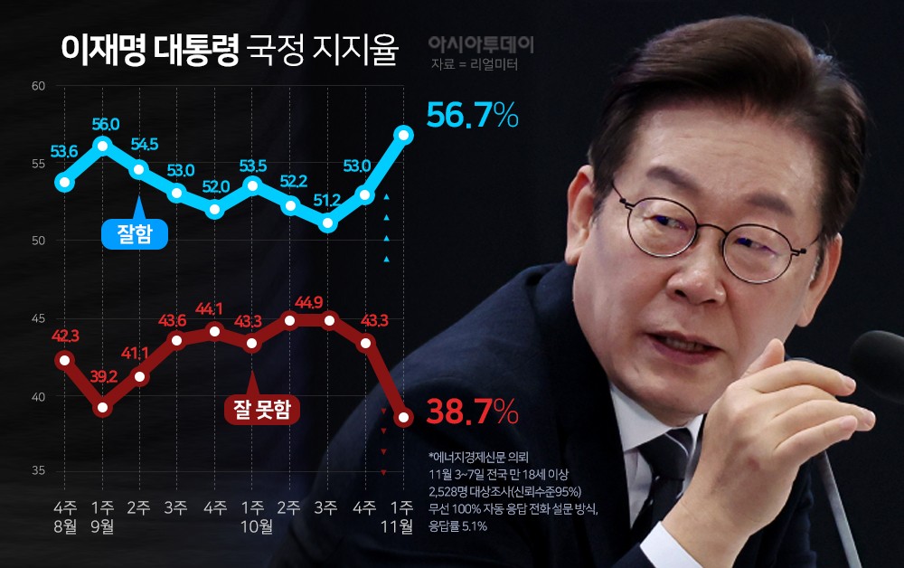 李대통령 국정 지지율, 전주보다 3.7%p 오른 56.7..