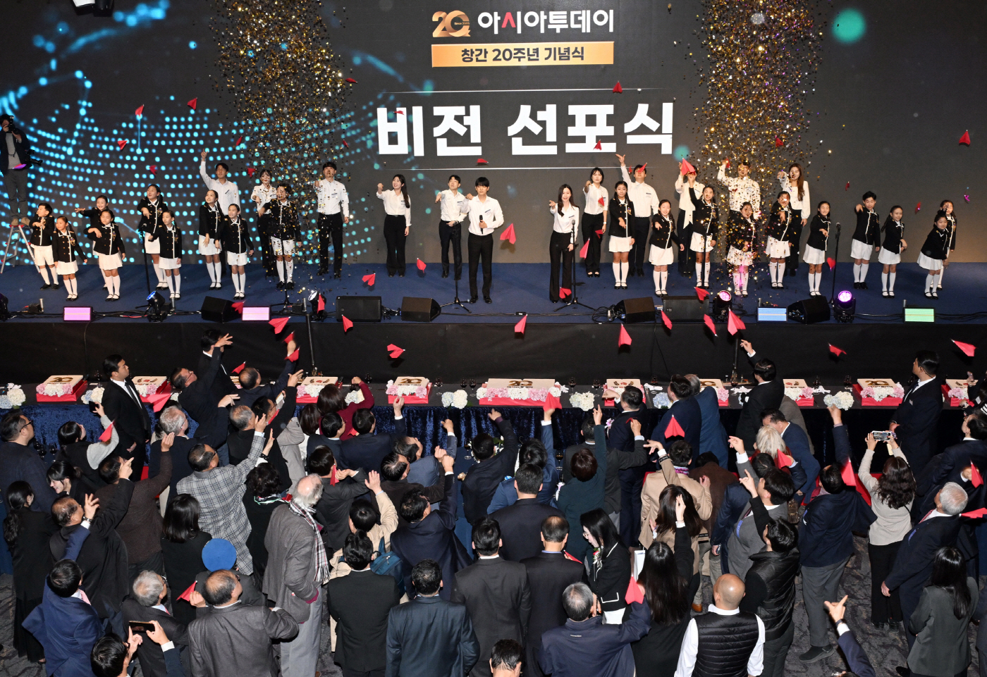 기념식은 가야금과 바이올린이 어우러진 현악 연주로 시작됐다. '정론의 힘으로 미래를 열다'라는 주제의 영상에선 2005년 창간 이후 아시아 중심 언론을 지향하며 모바일 콘텐츠 확대, 베트남·중국 등 해외 특파원 파견, 글로벌 보도망 구축 등을 통해 전국 12대 종합 일간지 반열에 오른 지난 20년의 기록이 파노라마처럼 소개됐다. 이어 창간 20주년을 기념하는 떡케이크 커팅식과 종이 비행기를 날리며 향후 도약을 위한 비전 선포식이 진행됐다.