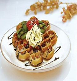 '떡보의 하루 쌀와플'은  쌀가루를 이용해 맛있게 구운 와플에 초코시럽을 뿌려 먹는 것도 별미지만 아이스크림이나 과일을 얹어 먹어도 독특한 맛을 느낄 수 있다. 가격은 5000원.
