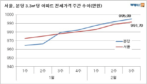 2일 부동산114(www.r114.com)에 따르면 경기소 성남시 분당신도시 3.3㎡당 아파트 전세가격(995만원)이 올해 들어 서울(991만원)을 역전한 것으로 나타났다.