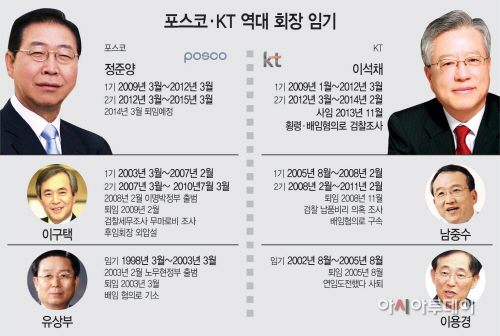 정 회장과 이 회장을 비롯해 역대 포스코와 KT CEO는 정권교체 때마다 회장직에서 물러나는 일이 되풀이 됐다. 포스코의 경우 민영화가 이뤄진 2000년 당시 회장직을 맡고 있던 유상부 전 회장은 노무현 정부가 출범하면서 연임을 시도했지만 낙마했다. 유 회장은 이후 배임혐의로 기소됐다.
