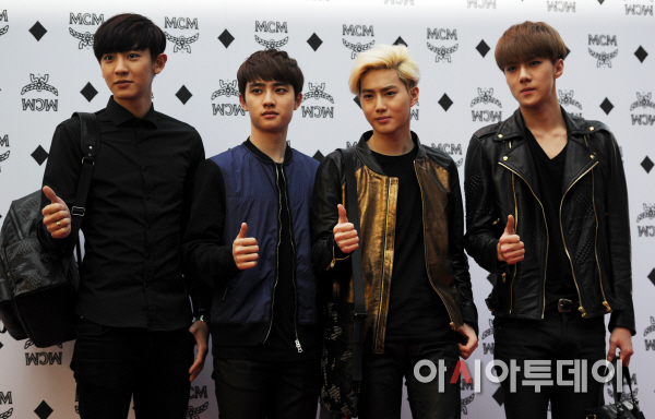 엑소 찬열과 디오, 수호, 세훈(왼쪽부터)이 명동에서 열린 ‘MCM 큐트 몬스터 파티’에 참석해 포토타임을 갖고 있다.?이날 포토행사는 독일 정통 명품 브랜드 MCM이 브라질 문화를 담은 ‘큐트 몬스터’ 스페셜 라인의 론칭을 기념하게 위해 열린 행사이다.?한편 이날 포토행사에는 엑소(수호, 찬열, 세훈, 디오, 타오, 시우민, 레이, 첸), 서강준, 왕빛나, 선미, 김산호, 댄싱9팀(하휘동, 이선태, 이루다, 한선천, 김명규), 패션모델 에스팀 등 패셔니스타들이 참석해 자리를 빛냈다.