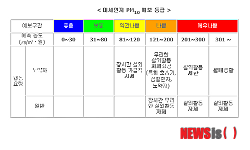 나라에서 하는 미세먼지 사전 예보·경보제에도 귀를 기울여야 합니다. 예보 내용이 ‘약간 나쁨’ 이상이거나 실시간 농도가 높을 경우 가급적 외출시간을 줄이고, 외출 시는 황사마스크를 착용하는 것이 좋습니다.
