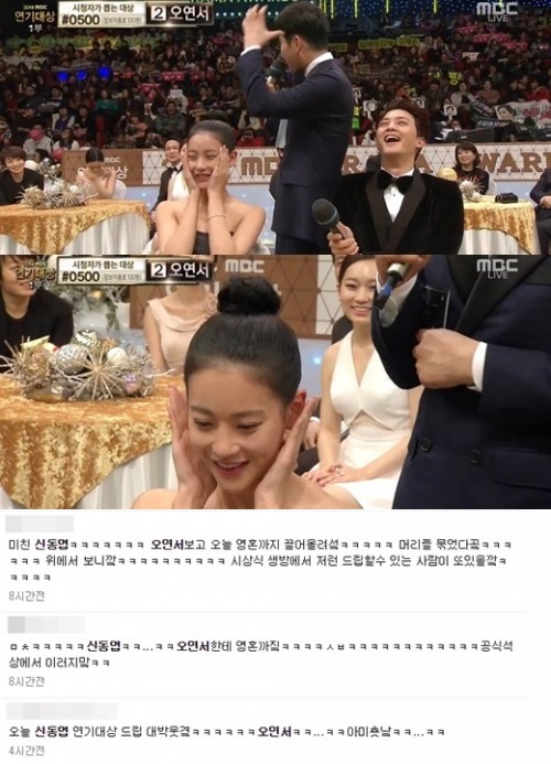네티즌들은 "MBC 연기대상 최고의 1분은...신동엽 씨가 오연서 씨 인터뷰 할 때! 웃프다고 해야할지...", "오연서 신동엽이 영혼까지 끌어 모은 머리라는 말에 꺌꺌 거리면서 막 손바닥 파닥거리는데 귀엽다...♥", "시상식 생방에서 저런 발언할 수 있는 사람이 또 있을까" 등의 반응을 보였다.