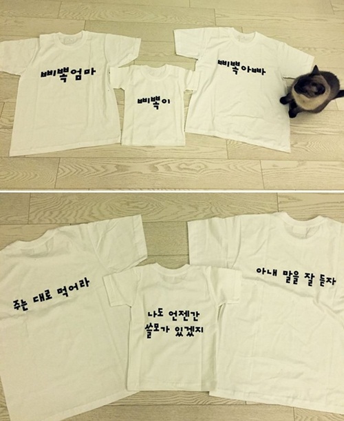 공개된 사진에는 '삐뽁엄마' '삐뽁이' '삐뽁아빠'라는 문구가 새겨진 티셔츠가 담겨있다. 특히 티셔츠 뒷면에는 '주는 대로 먹어라' '나도 언젠가 쓸모가 있겠지' '아내 말을 잘 듣자'라는 문구가 쓰여 있어 보는 이들의 웃음을 자아낸다.