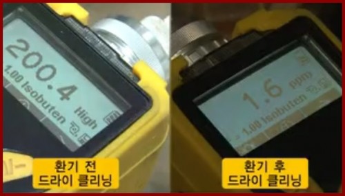 드라이클리닝 한 옷을 넣기 전 옷장 내 발암물질양은 0.1ppm. 하지만 비닐이 씌워진 드라이클리닝 옷을 걸어놓은 채 30분이 지난 후 기준치를 재어 보니 54ppm으로 500배 정도 증가했다.
