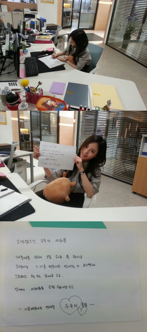 1일 소속사가 공개한 사진 속에는 이열음이 귀여운 글씨체가 담긴 편지와 함께 살포시 미소를 짓고 있는 모습이 담겨있다. 이열음은 "고생 많으신 근로자 여러분 재충전을 위해 오늘 하루 푹 쉬시고 주말에는 '이혼변호사는 연애중' 보시면서 스트레스 팍 팍 푸세요 ㅎㅎ 언제나 여러분을 응원합니다 ㅎㅎ 이혼변호사는 연애중 우유미 올림"이라고 직접 쓴 손글씨로 응원 메시지를 남겼다.