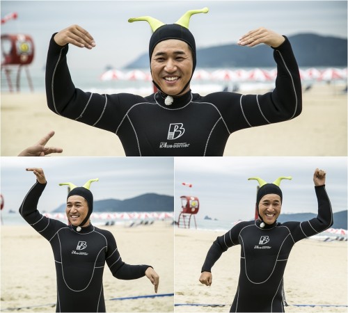공개된 스틸에서 김종민은 트럼프카드 조커와 싱크로율 200%인 모습으로 보는 순간 웃음을 터트리게 만들고 있다. 그는 ‘1박 2일’ 공식 작업복인 타이트한 해녀복을 입은 것도 모자라 초록색 더듬이처럼 보이는 모자까지 쓰고 있어 모두를 폭소케 만들고 있다.