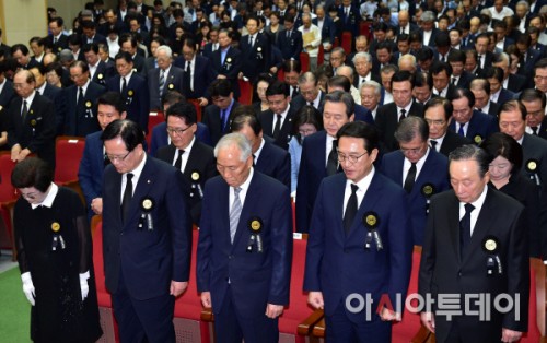 | 정의화 국회의장, 새누리당 김무성 대표와 새정치민주연합 문재인 대표 등 여야 지도부와 참석자들이 18일 서울 동작구 국립서울현충원에서 열린 김대중 전 대통령 서거 6주기 추도식에서 묵념하고 있다. /이병화 기자 photolbh@ |