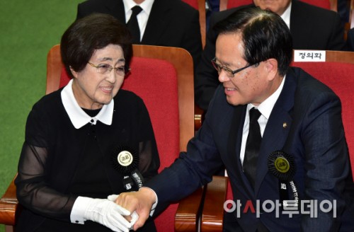 | 정의화 국회의장이 18일 서울 동작구 국립서울현충원에서 열린 김대중 전 대통령 서거 6주기 추도식이 끝난 뒤 이희호 여사의 손을 잡고 대화를 나누고 있다. /이병화 기자 photolbh@ |