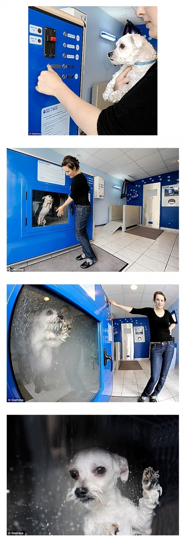 세탁기 처럼 생긴 기계 안에 개를 집어 넣는다. 그러면 기계가 돌아가고 그 개는 깨끗히 목욕이 돼서 나온다.