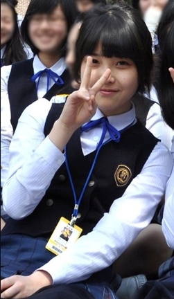 사진 속 아이유는 교복을 입고 브이포즈를 한 채 카메라를 응시하고 있다.